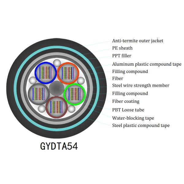 | GYDTA54 | Metallic strength membre,Fiber ribbon loose tube,Filling type,Aluminium-PE sheath,Longitudinal corrugated steel tape armored,PE outer jacket,Anti-termite | Direct burial,Anti-termite |